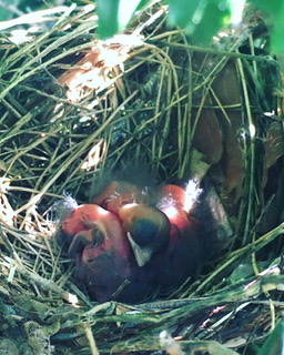 There is a cardinal nest in the bush outside my window. The babies are a little less than a week old. Each day I check on them, check on their progress and wonder which will come first: